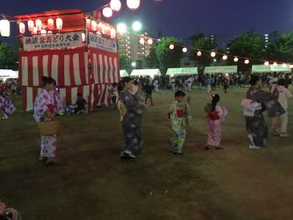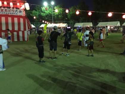 日が沈み、提灯に灯りがともると盆踊りの始まりです。