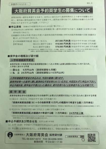 「大阪府育英会予約奨学生の募集について」のお知らせプリントは8月27日に、3年生に配布済みです。