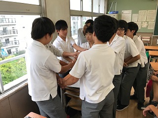6人が適当に右手と左手をクロスさせてつなぎ、くんずほぐれつ状態になったものを一つの輪にもどす、という競技です。