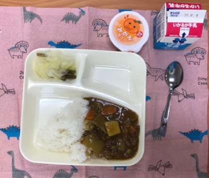 今日のメニューは「カレーライス[米粉](ご飯)・野菜のピクルス・みかんゼリー・牛乳」の4品です。
