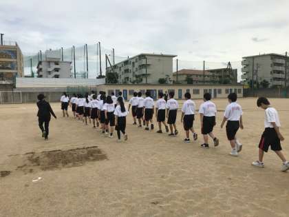 各クラス分かれて練習した後、全体で入場行進の練習をします。