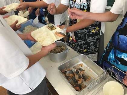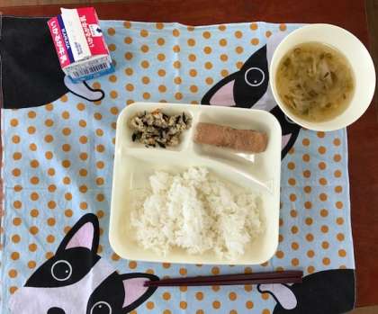 今日のメニューは「鮭(サケ)の醤油風味焼き・高野豆腐の炒り煮・五目汁・ご飯・牛乳」の5品です。