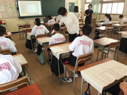 教室で「基礎縫いファイルカバー 刺し子図案」の学習です。