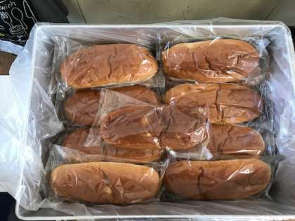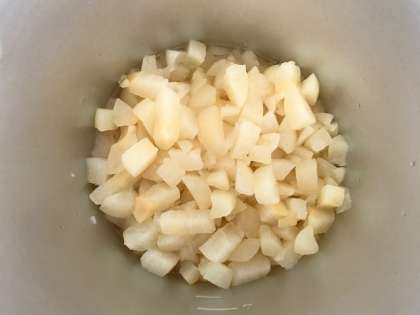 写真中:デザートの「和梨(カット缶)」です。1人5切れぐらいです。