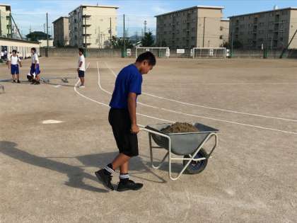 かき出した土は手押し一輪車に積んで運動場の隅に集めます。