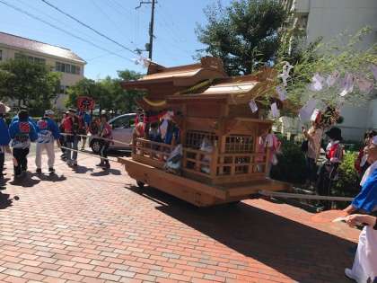 鉦(かね)と太鼓の音に乗り、たくさんの大人と子どもが「わっしょい。わっしょい。」の掛け声で井高野の町を練り歩きました。