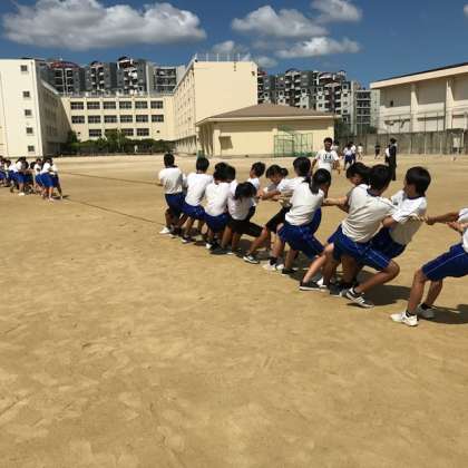 写真上:色別対抗綱引きの練習です。2年2組VS1・3年2組で練習しています。