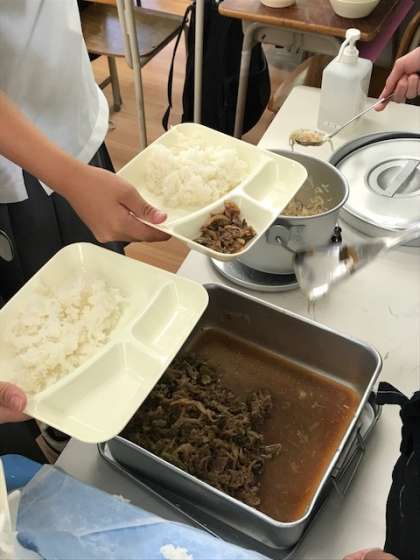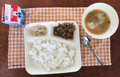 今日のメニューは「プルコギ・トック・もやしの甘酢和え・ご飯・牛乳」の5品です。 韓国料理です。