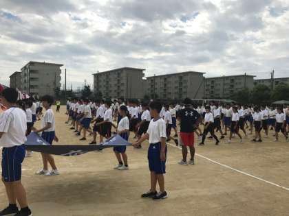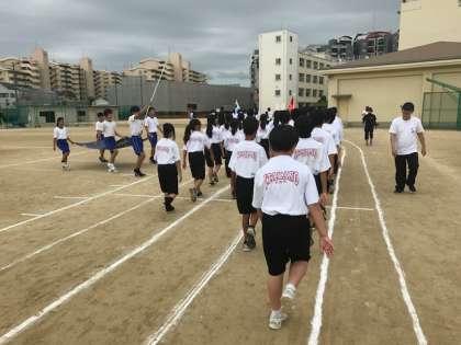 1年3組が最後に本部前を行進し、フィールドに入ってきて全体がそろい、全員で前へ進みます。