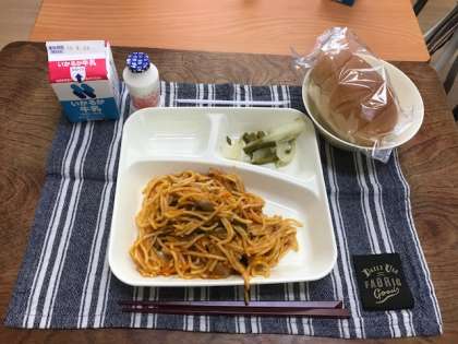 今日のメニューは「イタリアンスパゲッティ・グリーンアスパラガスとキャベツのサラダ・発酵乳・黒糖パン・牛乳」の5品です。