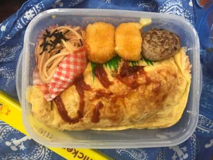 今日のメニューは「オムライス・クリームコロッケ・ハンバーグ・タラコスパゲティ・卵焼き・ナポリタンスパゲティ・焼売(しゅうまい)・豚のアスパラ巻・竹輪の磯辺揚げ・から揚げ・缶みかん」などです。