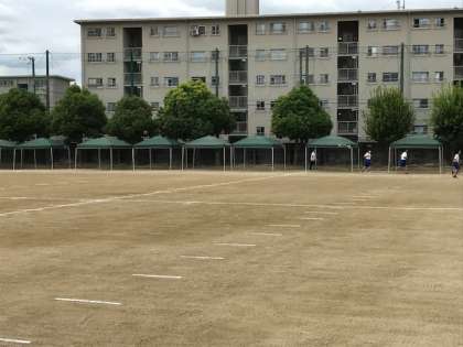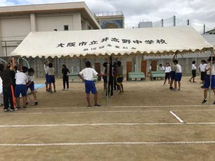 写真下;生徒席のテントも完成、ずらっと並んでいます。