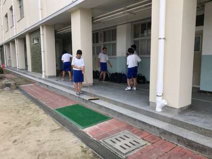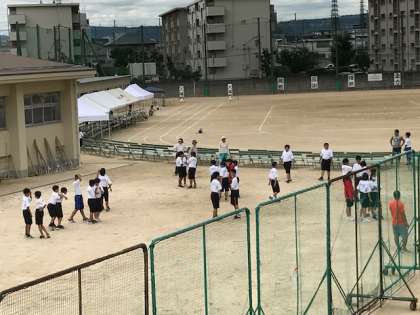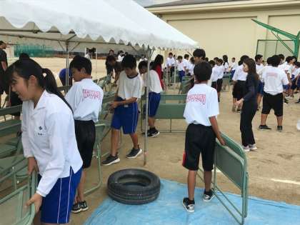 写真上:テントが完成したので、本部や保護者席の長椅子などを並べます。