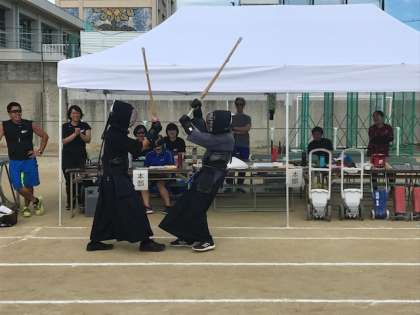 写真中 剣道部の打ち合い、迫力満点です。
