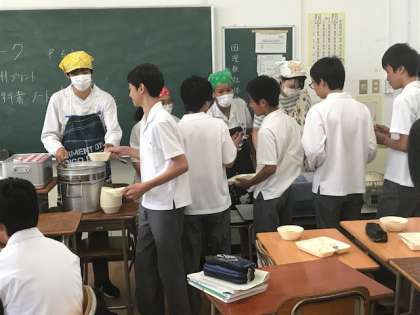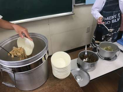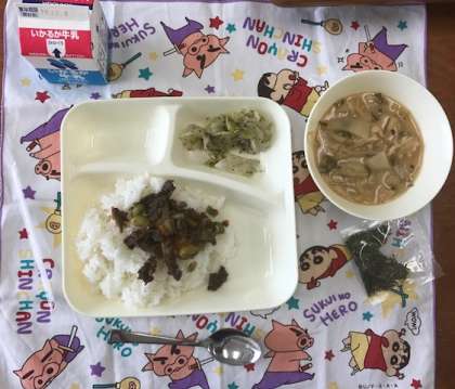 今日のメニューは「ご飯・牛肉のきんぴらちらし(きざみ海苔を添えて・キャベツの赤紫蘇揚げ・牛乳」の5品です。