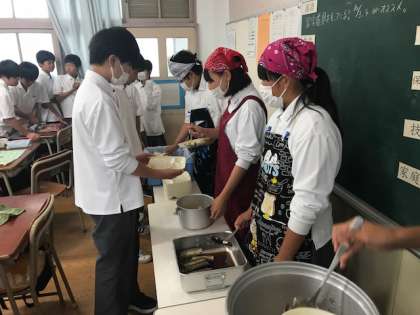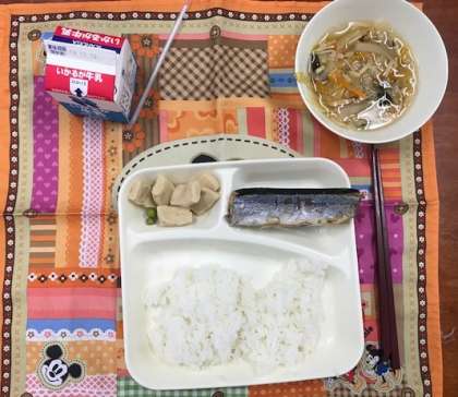今日のメニューは「秋刀魚(さんま)の山椒(さんしょう)焼き・高野豆腐の煮物・すまし汁・ご飯・牛乳」の5品です。