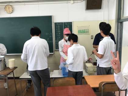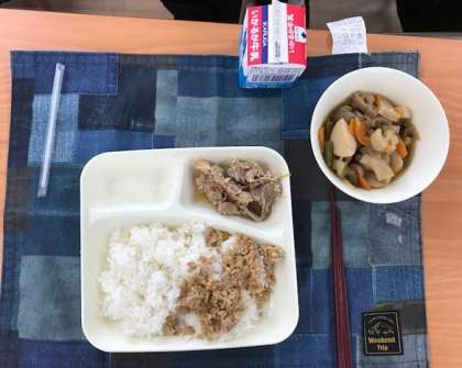 今日のメニューは「豚肉ンのねぎ醤油焼き・ツナ大豆そぼろ(ご飯に添えて)・ご飯・吹き寄せん煮・牛乳」の5品です。