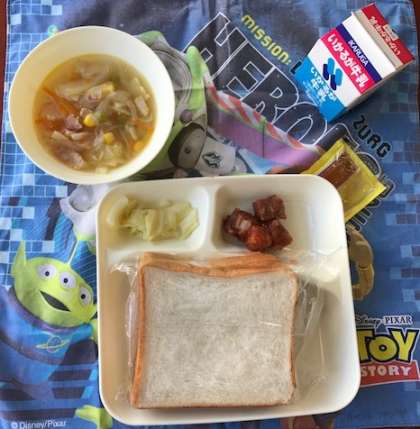 今日のメニューは「鮪(まぐろ)のオーロラ煮・キャベツの柚子(ゆず)ドレッシング・ベーコンとじゃがいものスープ・食パン(アプリコットジャムを添えて)・牛乳」の5品です。