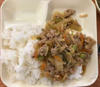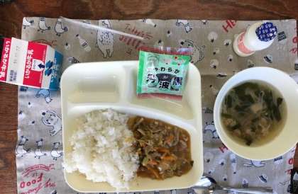 今日のメニューは「ピリ辛丼(ご飯)・中華スープ・ソフト黒豆・発酵乳・牛乳」の5品です。