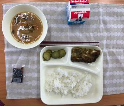 今日のメニューは「お好み焼き(+トンカツソース)・胡瓜の甘酢和え・豚汁・ご飯・牛乳」の5品です。