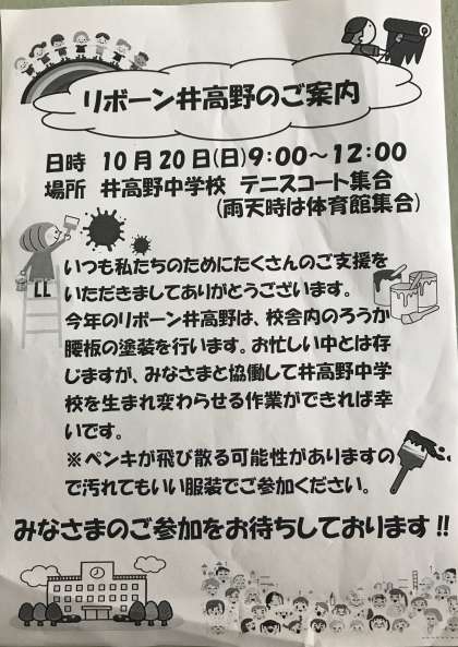 お忙しいと存じますが、ご参加いただき皆様と生徒と教職員の協働で井高野中学校を生まれ変わらせる作業ができれば非常にありがたいです。