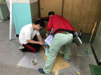 班で使いやすいようにペンキを一斗缶から大きなペットボトルに詰め替えています。