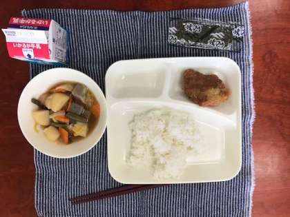 今日のメニューは「みそカツ・じゃがいもと野菜の煮物・ご飯・焼き海苔・牛乳」の5品です。