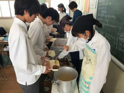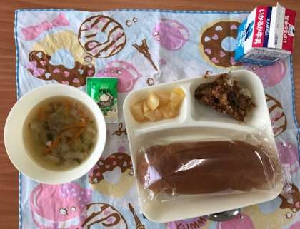今日のメニューは「茄子(なす)のミートグラタン・鶏肉と野菜のスープ・大型コッペパン(ソフトマーガリン添え)・白桃(カット缶)・牛乳」の5品です