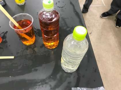 写真上 科学マジックです。色のついた水ですが、ボトルを振ると無色透明になります。