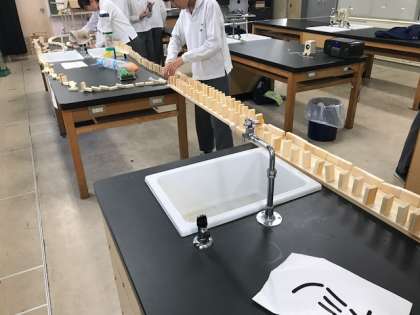 写真中 ドミノです。机と机の間の橋を越え、長々と続いています。
