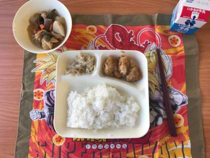 今日のメニューは「揚げ鶏のねぎだれかけ・もやしの柚子の香和え・含め煮・ご飯・牛乳」の5品です。