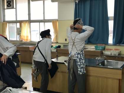 写真上 まずはエプロン・三角巾・マスクをうけて手を洗います。