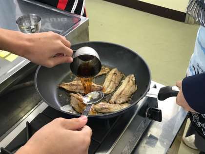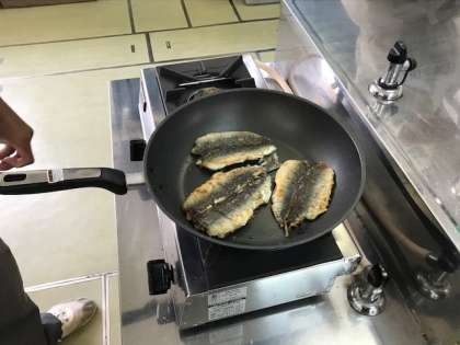 写真中 両面とも焼きます。身がバラバラにならないように上手にひっくり返しましょう。