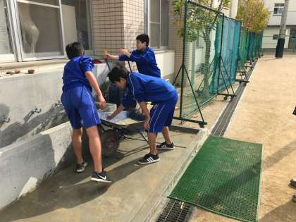 写真上 側溝の泥あげで使ったネコ車を洗っています。