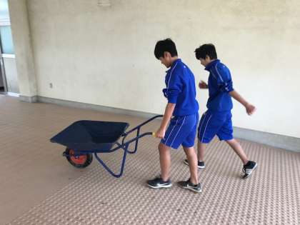 写真中 洗ったネコ車を倉庫まで直しに行ってます。