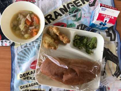 今日のメニューは「白身魚のフリッター・ブロッコリーのサラダ・スープ煮・ライ麦パン・牛乳」の5品です。