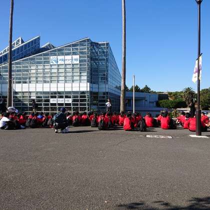 写真上 入館前の事前指導。みんながんばれ。