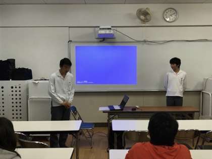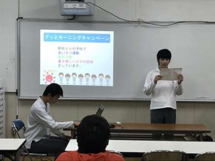 パワーポイントを使っての説明で、「グッとモーニングキャンペーン」や「リボーン井高野」など生徒会の取り組みについて発表してくれました。