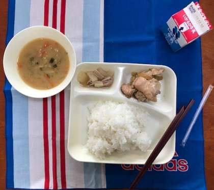 今日のメニューは「鶏肉の甘辛焼き・大根の煮物・味噌汁・ご飯・牛乳」の5品です。