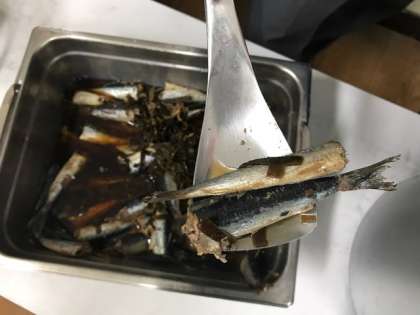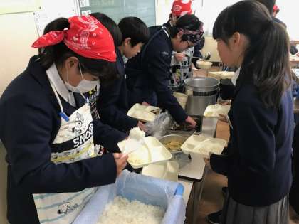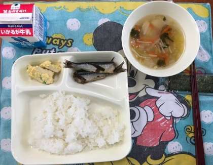今日尾のメニューは「鰯の生姜煮・高野豆腐の卵とじ・薄葛汁・ご飯・焼き海苔・牛乳」の6品です。