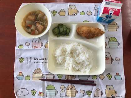 今日のメニューは「鱈(たら)のフライ・あっさり胡瓜(きゅうり)・豚肉と厚揚げの煮物・ 今年最後の給食です。ご飯・牛乳」の5品です。