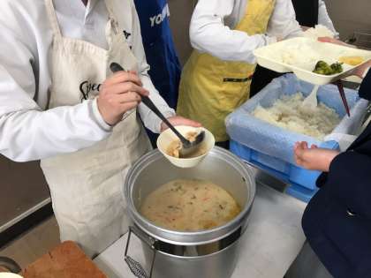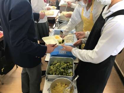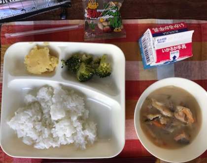 今日のメニューは「粕(かす)汁・ブロッコリーの生姜漬け・栗きんとん・豆昆布(こんぶ)・ご飯・牛乳」の豪華6品です。