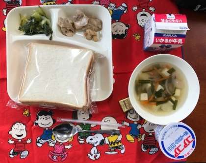 今日のメニューは「鶏肉のオイスターソース焼き・海老と豆腐のスープ・青梗菜(チンゲンサイ)のピリ辛和え・食パン(バターを添えて)・ヨーグルト・牛乳」の6品です。