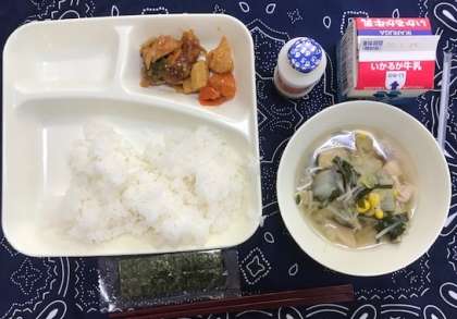 今日のメニューは「酢豚・中華スープ・焼き海苔・ご飯・牛乳・発酵乳」の6品です。