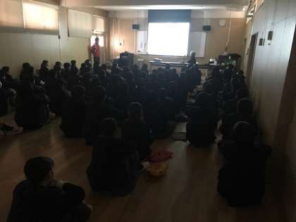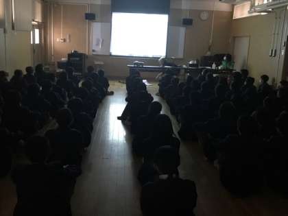 歯科校医の先生に来ていただいて「葉と口の健康教室」を1年生対象に実施しました。