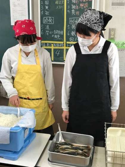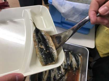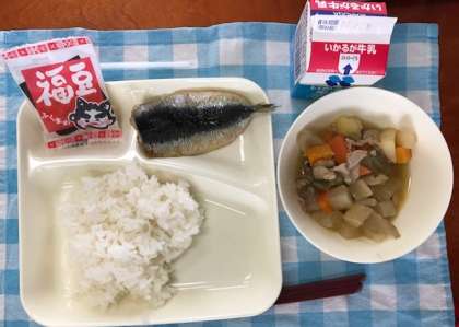今日のメニューは「いわしの生姜醤油かけ・含め煮・ご飯・炒り大豆(服豆)・牛乳」の5品です。