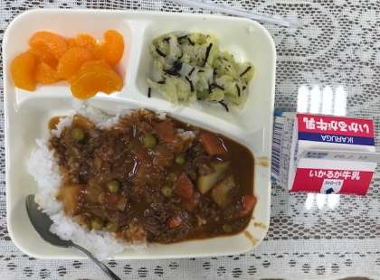 今日のメニューは「ハヤシライス(ご飯)・キャベツのひじきドレッシング・みかん(館)・牛乳」の4品です。