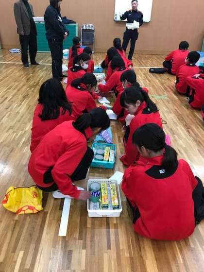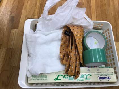 雑誌や新聞、ラップにネクタイなどの日用品を使っての止血方法などの応急措置について学びました。