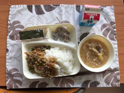 本日のメニューは【ごはん 牛乳 鶏ごぼうご飯 みそ汁 焼きれんこん 焼きのり】です。