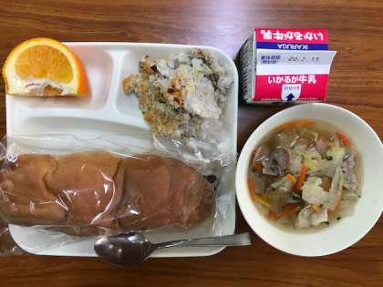 今日のメニューは「押し麦のグラタン・スープ・レーズンパン・伊予柑・牛乳」の5品です。